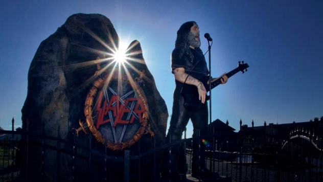 The statue features the band’s iconic logo on a giant boulder behind Araya, with the slab of stone underneath him reading lyrics from the SLAYER tune ‘Dead Skin Mask.’