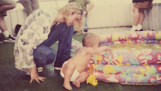 На едната (виждате я горе), КОБЕЙН е с нея като много малка до бебешки басейн, а на другата, музикантът позира пред камерата с фланелка на BREEDERS.